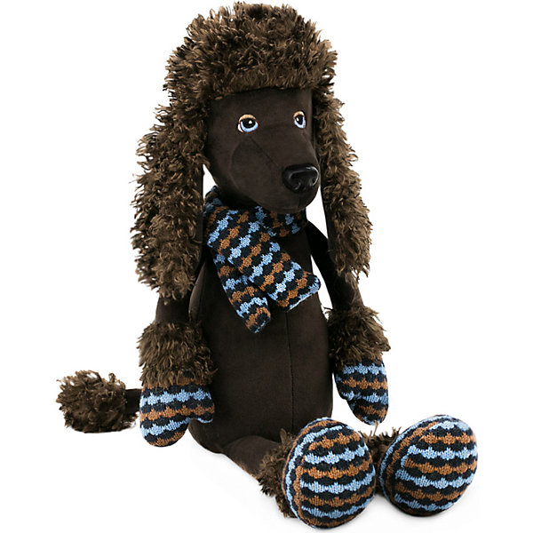 Мягкая игрушка пудель с большими глазами на чьей-то ладони.