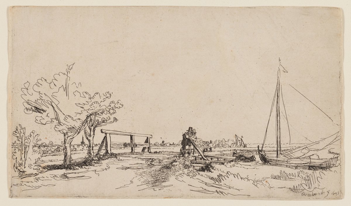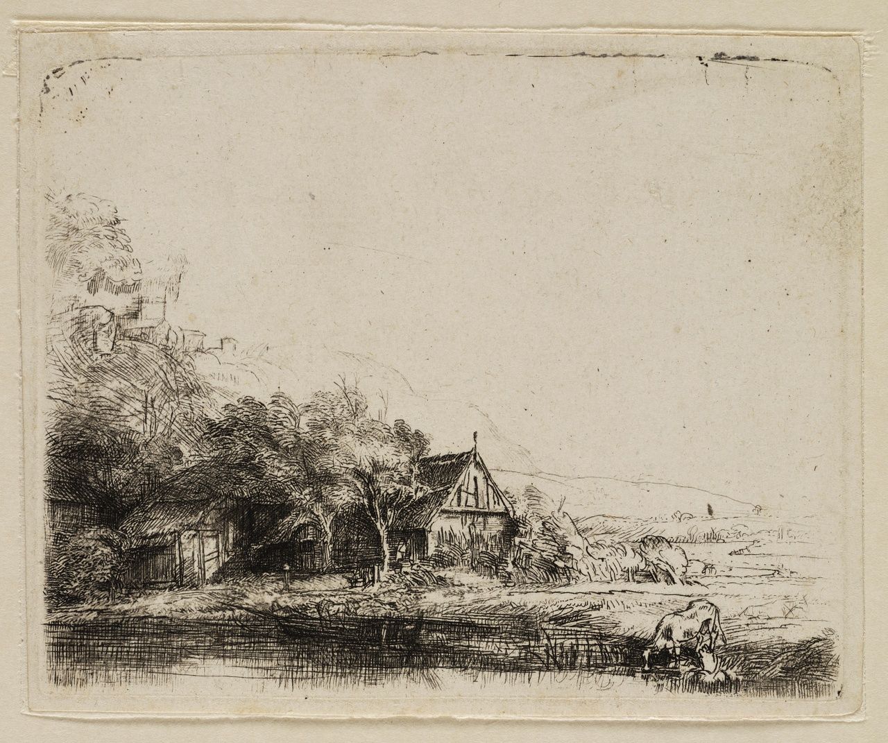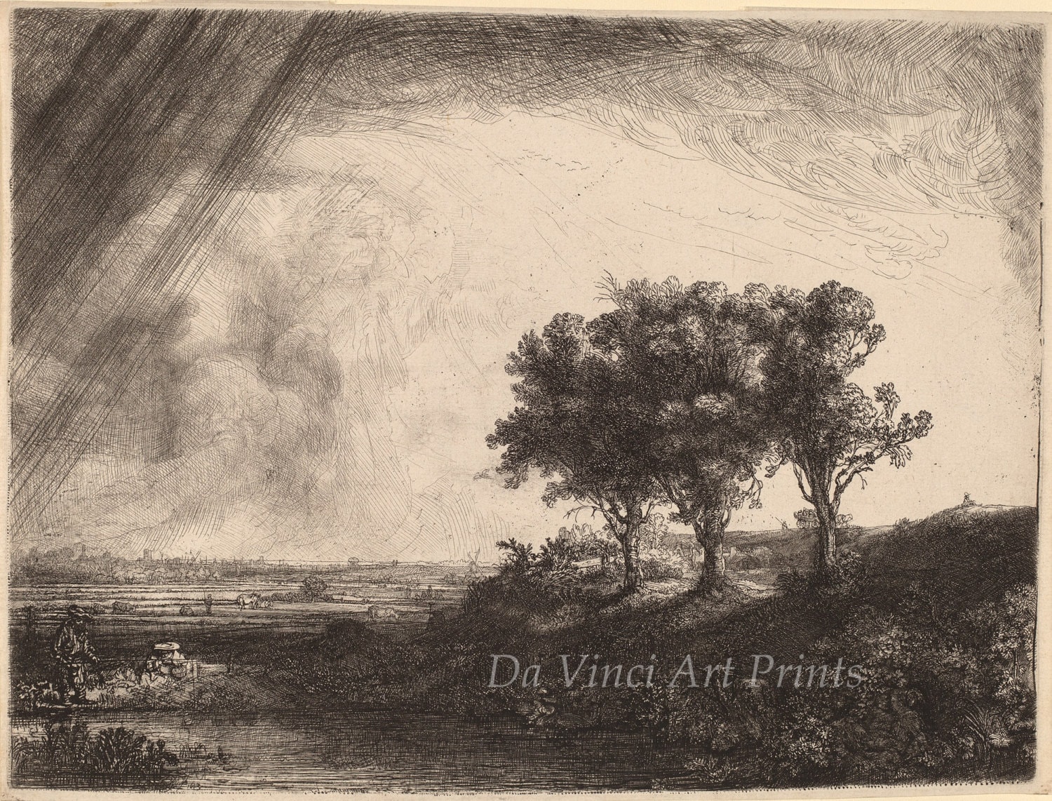 В то время как его пейзажные офорты варьируются от быстрых набросков до подробных исследований природы и взаимоотношений человека с окружающей средой, большинство его пейзажей изображают места в Амстердаме или поблизости от него. Многие из выгравированных пейзажей отображают особенности Амстердама, поскольку эти офорты Рембрандта, вероятно, были вдохновлены реалистичными мотивами, которые Рембрандт нарисовал, прогуливаясь по своему дому. Ранние пейзажные сцены Рембрандта обычно фокусируются на детализированном переднем плане, расположенном на изящно предполагаемом горизонте, в то время как его более поздние пейзажные сцены передают более подробный фон, часто включающий воображаемые элементы, такие как горы или экзотические здания.