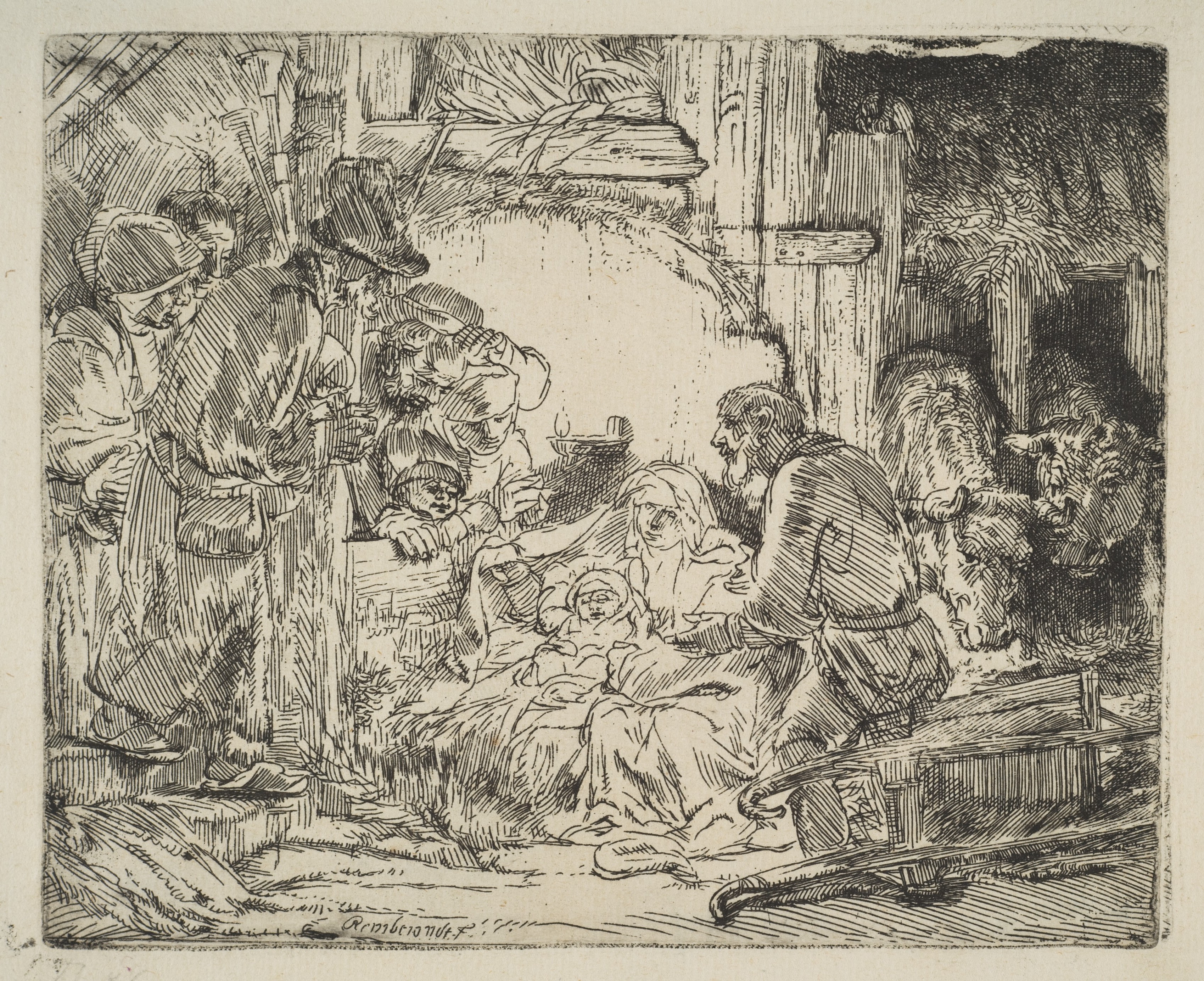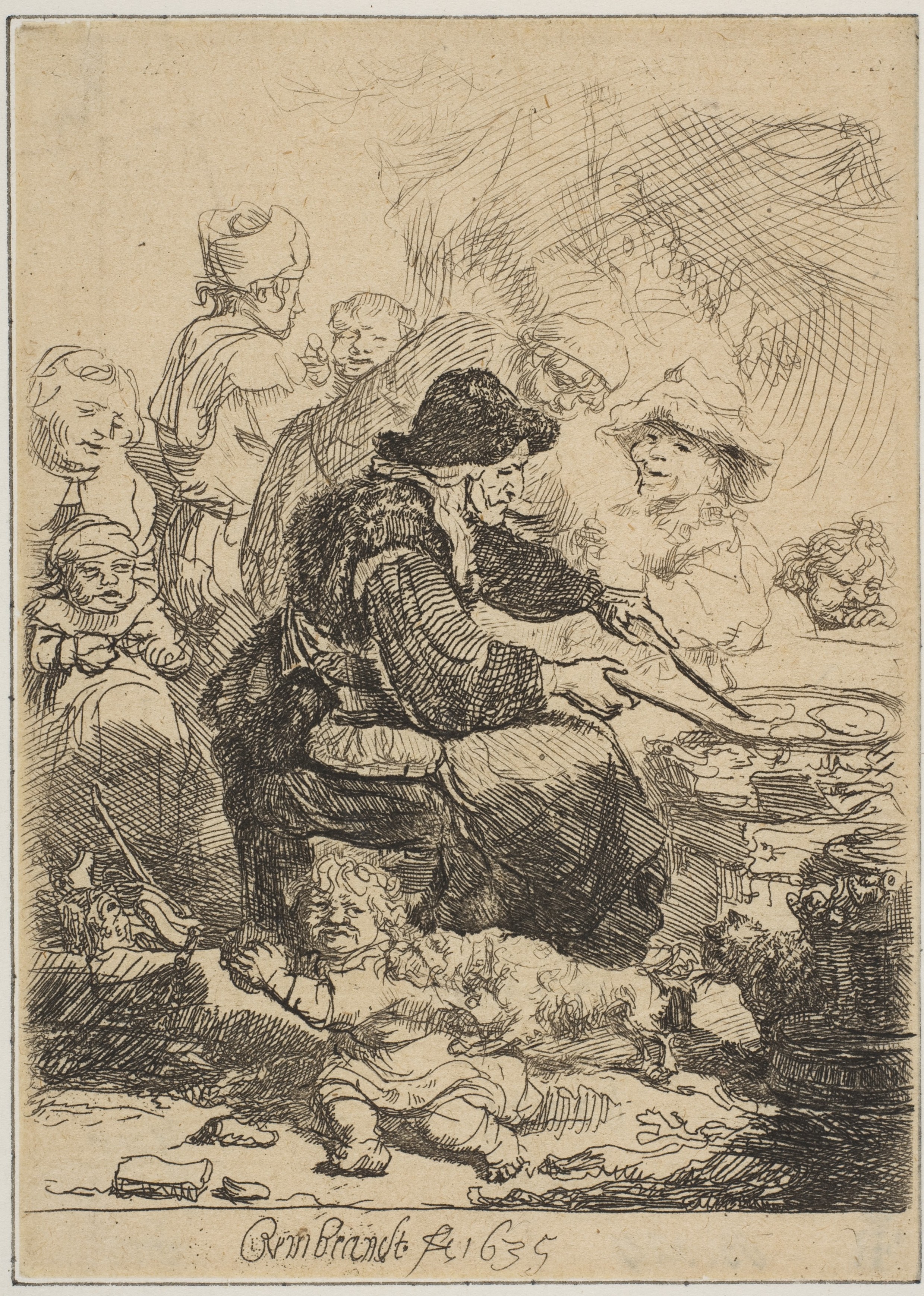 «Явление ангела пастухам» (1634) «Блинщица» (1635)Рембрандт занимался офортами на протяжении всей творческой жизни, первые два офорта «Отдых на пути в Египет» и «Обрезание» датированы 1626 годом, а последний «Портрет Яна ван дер Линдена» выполнен в 1665 году. Он также коллекционировал офорты других художников, таких, как Дюрер, Сегерс, Кастильоне.