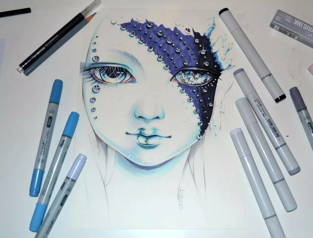 Рисование без контура, только с помощью маркеров. Встречается реже, потому что маркерами не всегда можно нарисовать аккуратные мелкие детали. Однако крупнодетальные рисунки смотрятся в такой технике очень круто. Довольно известная Pomme Chan рисует в такой технике.
