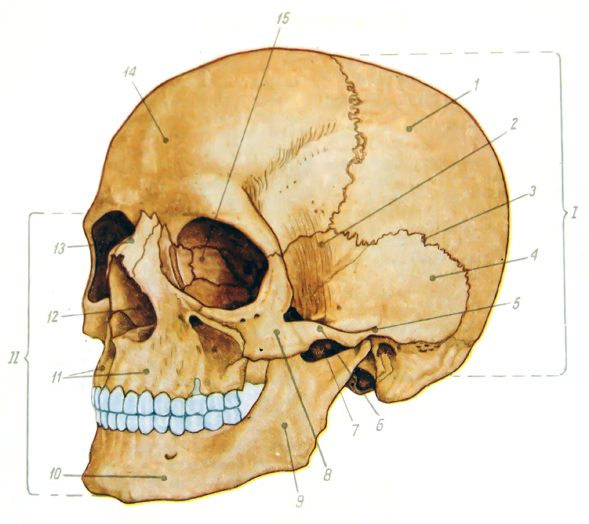 Череп принято разделять на 2 отдела – череп мозговой и череп лицевой.