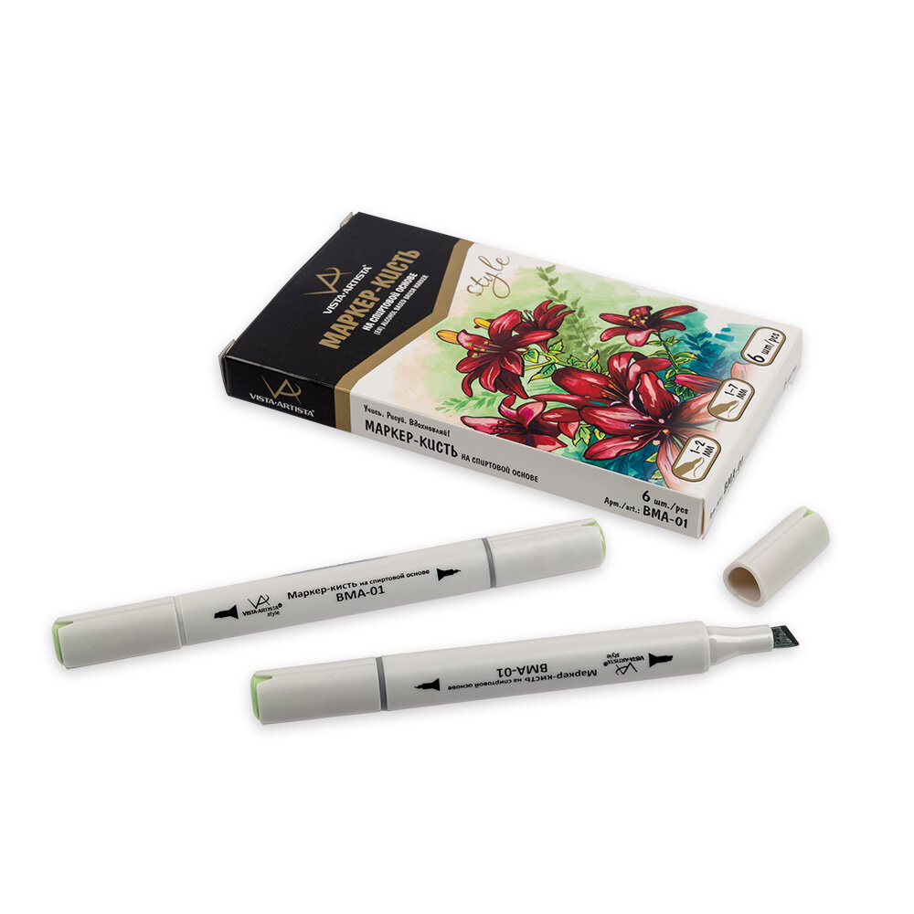 Маркеры Vista-artista есть двух видов — обычный двухсторонний маркер и маркер-кисть. В отличие от, например, Promarker, кистью — то есть мягким наконечником, чувствительным к нажатию — здесь является именно тонкий конец. Второй конец в обоих случаях широкий, плоский скошенный.