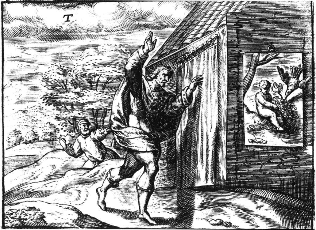 Паррасий, напротив, показал занавес, задернутый с такой необычайной правдивостью, что Зевксис, воодушевленный оценкой, вынесенной птицами над его работой, надменно потребовал, чтобы занавес был отдернут, чтобы можно было увидеть картину. .Обнаружив свою ошибку, он с большой долей наивной прямоты признал, что его превзошли, ибо если он сам только обманул птиц, то Парразий обманул его, художника.