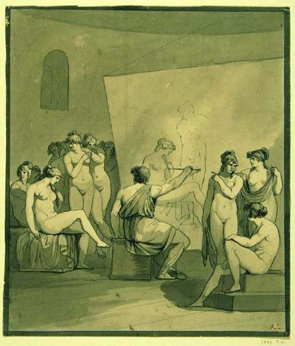 Хотя такая история, казалось бы, имела очевидную привлекательность для художника, предоставляя художнику возможность продемонстрировать свое представление о том, как лучше всего достичь совершенства, Винсент и Монсио (рис. )[22] были единственными художниками. выставлять этот предмет в салонах восемнадцатого века. В то время как картина Монсио является лишь слабым производным от композиции Винсента и Студии Апеллеса Брока 1800 года (предмет, выставленный четыре раза ранее[23] в этом столетии и существующий на рисунке Винсента 1815 года), технически ошибочна, это были художники жанра , такие как Луи Леопольд Бойи (в его Студия Изабе 1798 года и Студия Гудона 1804 года) и ученик Давида Л.